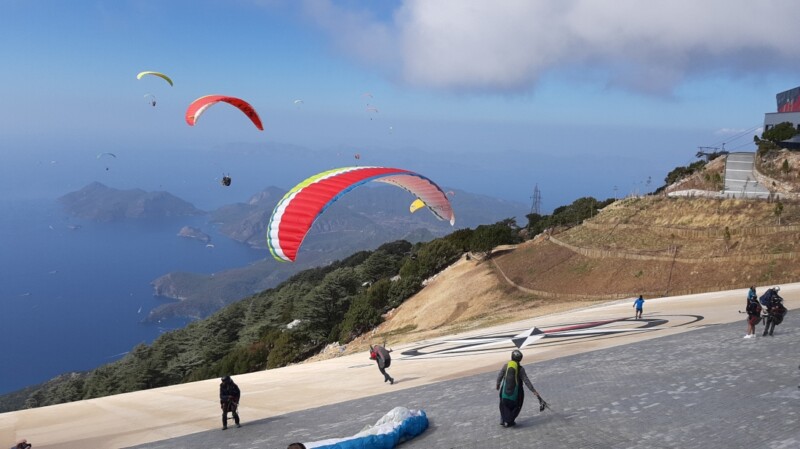 Ein bisschen Skepsis war bei der Auswahl dieses Reisezieles schon dabei. Aber man tut diesem Land und seinen überaus gastfreundlichen Menschen einfach Unrecht, wenn man es auf seinen gegenwärtigen Machthaber reduziert. Wir erlebten eine fantastische Woche inmitten wunderschöner Natur, am kristallklaren und angenehm warmen Mittelmeer, lernten die perfekte Logistik dieses einmaligen Flugberges kennen, genossen traumhafte Flüge aus fast 2000 m Höhe mit Landung direkt am Strand und ließen uns von der türkischen Küche verwöhnen. Kaum zu glauben, dass bis vor kurzem nur auf abenteuerlichen Bergpfaden zum Gipfel gefahren wurde – heute führen parallel eine komplett gepflasterte Strasse und eine moderne Seilbahn bis ganz nach oben. Die Startplätze sind weltweit einmalig – besser präparieren geht nicht. Kein Wunder, dass sich davon sehr viele Piloten anlocken lassen, welche die unglaubliche Menge der einheimischen Tandempiloten noch zusätzlich vermehren. Da wird es an den Start – und Landeplätzen schon mal eng. Aber die Flüge über die Bucht entschädigen allemal und man findet immer noch eine Lücke zum Starten und ein freies Ende am endlosen Sandstrand. Kurzum: Die Woche ließ weder fliegerisch noch touristisch Wünsche offen. Hier waren wir garantiert nicht das letzte Mal. Vielen Dank auch an Mehmet, der uns vor Ort toll unterstützt hat. Hier eine Auswahl unserer Bilder